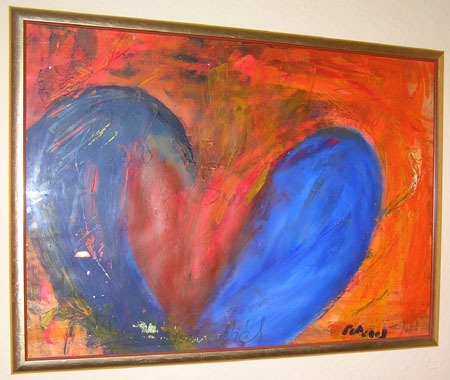 bei einer Ausstellung in meinem Atelier waren viele Gäste zugegen, unter anderem auch die Familie Sperlein, Frau Sperlein entdeckte auf einmal ein von mir gemaltes Bild, welches ich eigentlich gar nicht für die Öffentlichkeit ausgelegt hatte, es lag auf meinem Arbeitstisch, und sie sprach mich an, ob sie dieses Bild wohl von mir kaufen könnte, da es ihr so gut gefiele, jetzt kam ich ein wenig in Bedrängnis und zwar aus folgendem Grund, ich hatte zu dieser Zeit Liebeskummer, soll ja in den besten Familien vorkommen und genau diesen Schmerz habe ich mir in diesem Bild von der Seele gemalt, 2 Herzen schlugen auf einmal in meiner Brust, auf der einen Seite konnte ich dieses Bild, mit diesem dramatischen Hintergrund doch nicht verkaufen und außerdem was tue ich diesen beiden Menschen an. Ich zögerte ziemlich lange, nannte dann einen Preis und Familie Sperlein zog erstmal etwas weiter und meinte, sie kämen später nochmal...,derzeit kümmerte ich mich um meine anderen Gäste und hatte diese Begebenheit schon fast wieder vergessen, bis abermals die Tür aufging und Frau Sperlein wieder zielstrebig zu dem Bild ging und meinte, jawohl mir möchten es wirklich gerne haben. Jetzt kam die Stunde der Wahrheit, ich erzählte den beiden, was sich denn für eine Geschichte hinter diesem Bild verbirgt und dass sie hiermit meinen Liebeskummer mit auf den Weg bekämen und ich weiß nicht, ob ich dies verantworten könne, doch die beiden sind anscheinend so gefestigt in ihrer Beziehung, dass sie so etwas nicht erschüttern kann und auch keinerlei Angst einflösst. Also schickte ich den beiden mein gebrochenes Herz, in Bildform, mit auf den Weg und seit dem besuchen sie mich, immer noch vereint, in ihrer herzlichen und liebevollen Art in meinem Atelier, ich bin mittlerweile auch wieder mit meinem damaligen Liebeskummer glücklich vereint und erfreue mich weiterhin eines wundervollen Lebens. Vielleicht war es doch etwas mehr als nur ein Bild zu verkaufen.....