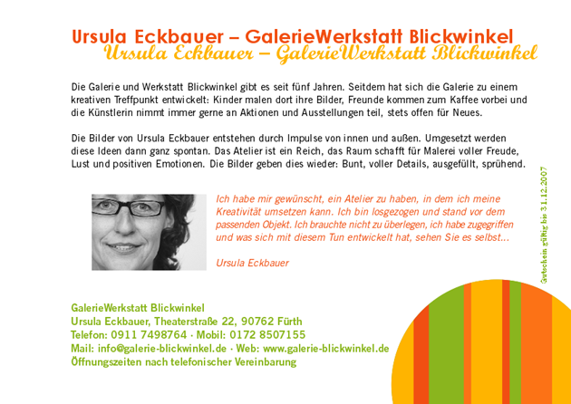 [Home] [UeberMich] [Mein Atelier] [Ausstellungen bisher und bis heute] [Erwerbsorte] [Malerei 2011] [Bildervermietung] [Wohnraumgestaltung] [Fotos aus verschiedenen Blickwinkeln] [Links] [Kontakt und Impressum]
