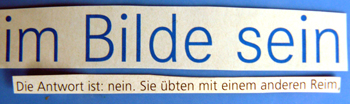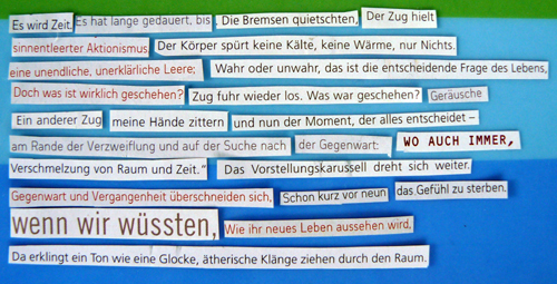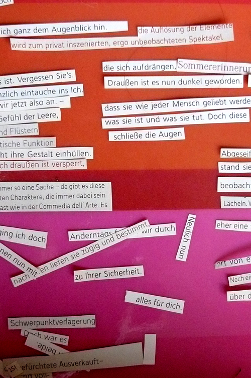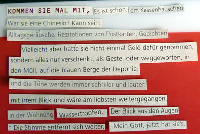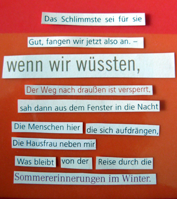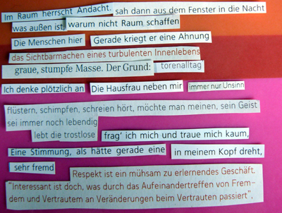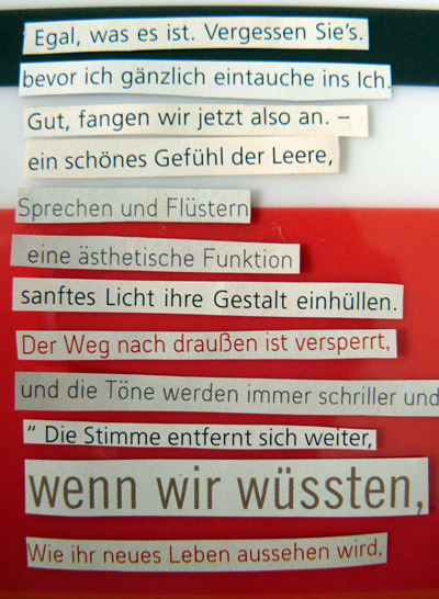 HIER HANDELT ES SICH UM WORTSPIELEREIEN - TEXTE AUS DEM ZUSAMMENHANG GERISSEN - NEU ANEINANDER GEREIHT - DER SINN VERÄNDERT SICH - DIE GLEICHEN WORTFETZEN - WILLKÜRLICH ANGEORDNET. EIN NEUES BILD - EINE NEUE DARSTELLUNG - NICHTS IST MEHR WIE ES WAR - IST ES NICHT ÄHNLICH WIE MIT UNSERER KOMMUNIKATION - JEDER VERWENDET DIE GLEICHEN WORTE UND DOCH VERSTEHT JEDER ETWAS ANDERES......trotz gleicher Worte